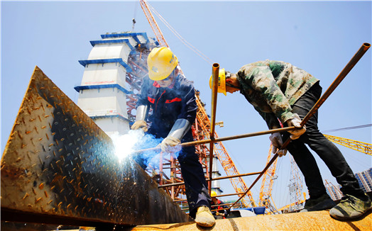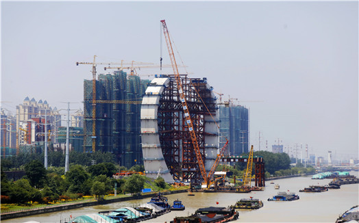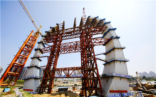 淮海路大桥钢箱梁陆续提吊成功 25层楼高桥塔月底合龙