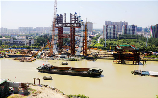 据中交二航局工作人员介绍,大运河桥主跨为钢制箱梁,总长度为242米,钢制箱梁运抵淮安属该工程重大节点。目前,施工方正在大运河上建设临时墩,届时将采取顶推作业的方法,把钢制箱梁顶送至桥北,与桥北引桥无缝对接。